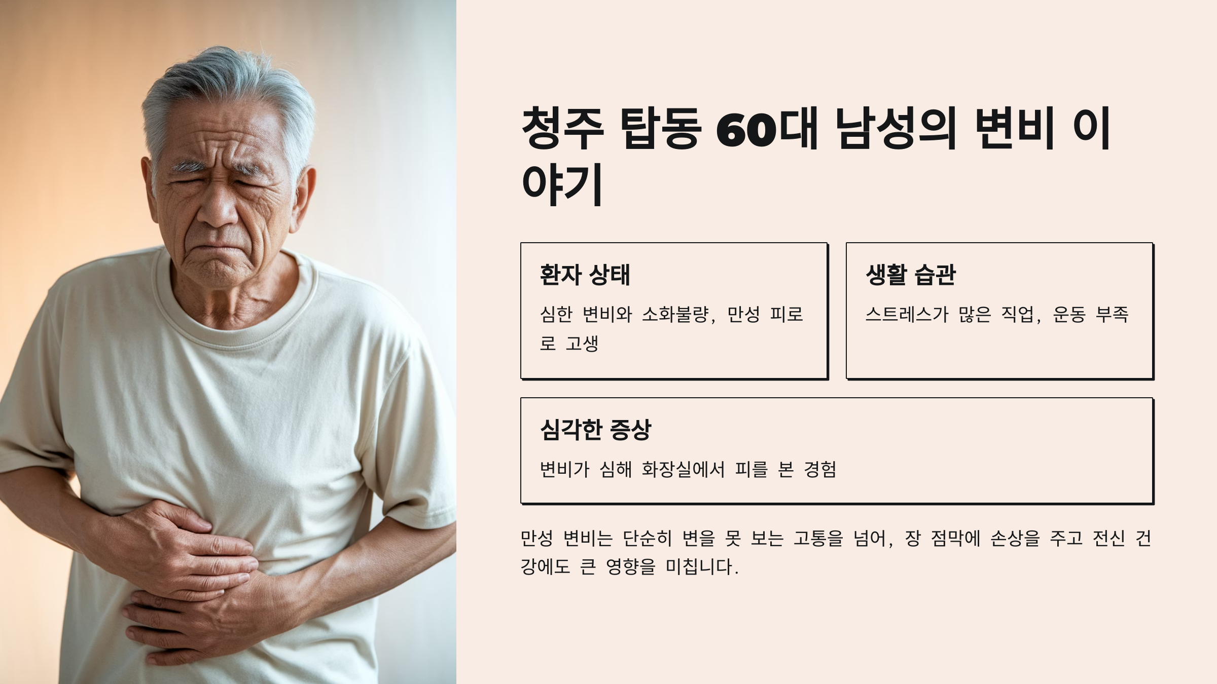 청주 탑동에 거주하는 60대 남성 환자분은 배변 활동이 원활하지 않아 화장실에서 긴 시간 머무는 일이 잦았고, 종종 출혈까지 경험했다고 말씀하셨습니다. 특히 스트레스가 많은 직업을 오래 유지해왔고, 운동이 부족했으며 전신적인 피로감을 자주 느꼈습니다.